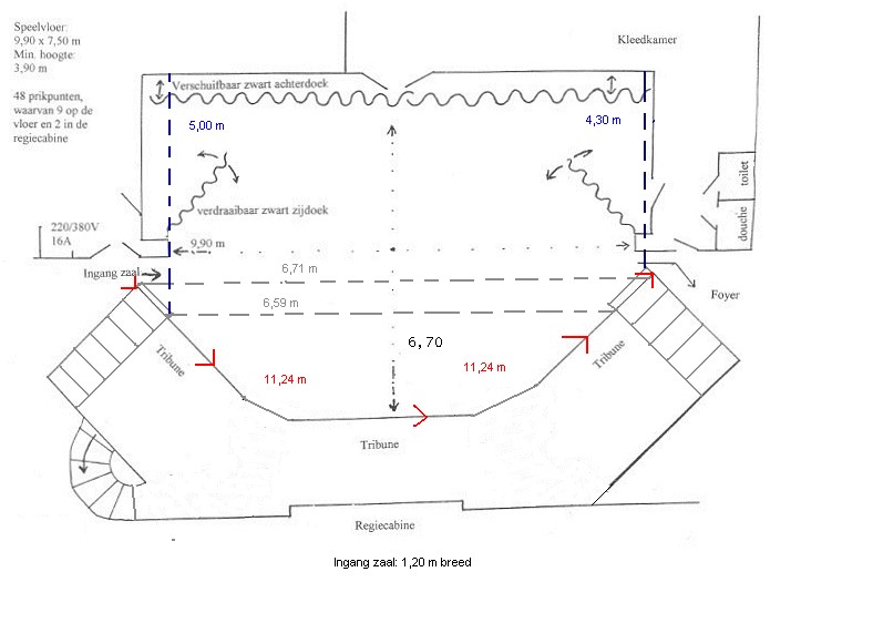 Vanuit de kleedruimte is het toneel van achteren te bereiken via het midden, links en rechts.